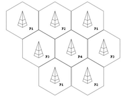 نمونهای شماتیک از یک شبکه سلولی. هر سلول ناحیهای است که توسط یک برج پوشش داده شدهاست.