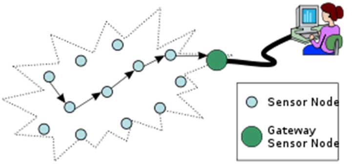 یک شبکه حسگر بیسیم. حسگرها میتواند از طریق حسگرهای واسطه اطلاعاتشان را به واحد مرکزی منتقل کنند.