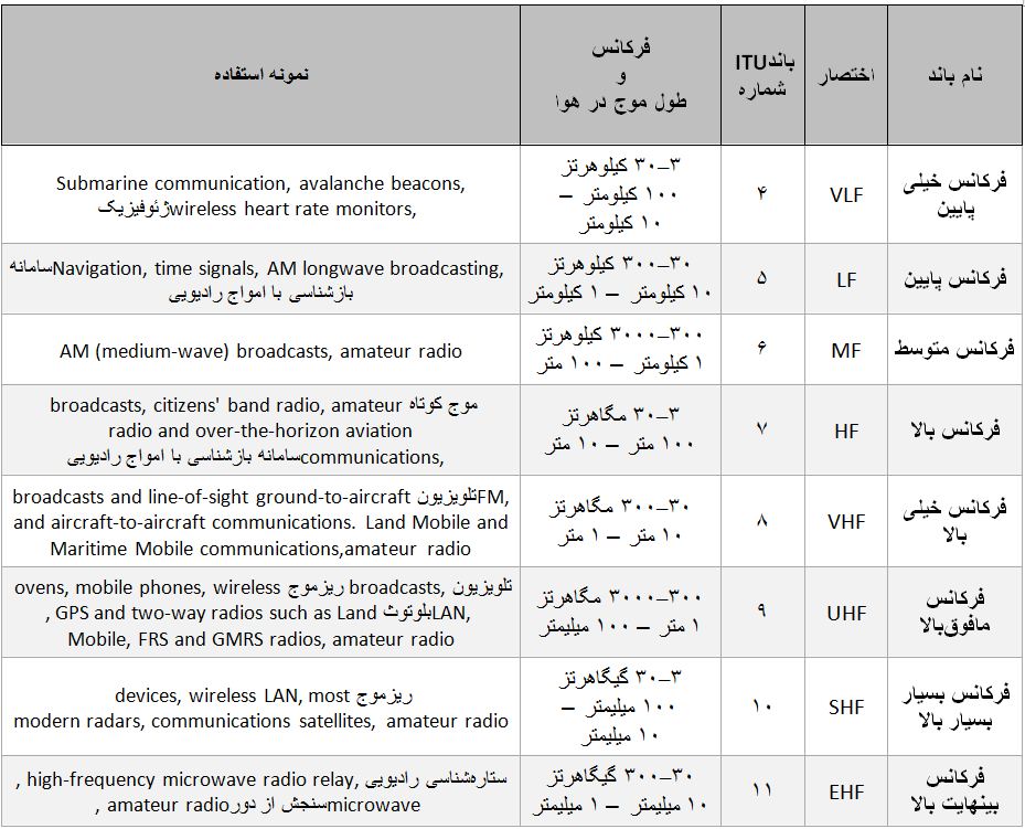 گستره فرکانسی بصورت دلبخواهی به باندهای مختلفی تقسیم بندی شدهاست. بخشهای مختلف طیف به کاربران مختلف مانند رادیو و تلویزیون و تلفن بیسیم و غیره اختصاص دادهاست. معروفترین دسته بندی گستره فرکانسی، دسته بندی اتحادیه بینالمللی مخابرات راه دور(ITU) میباشد.